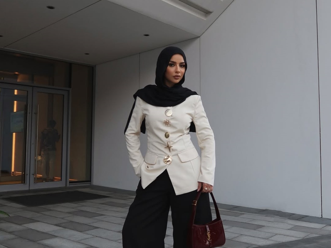 أما مدونة الموضة سهى طه، فقد اختارت أن تنسق البليزر الأبيض المزود بأزرار ذهبية مصممة بأشكال مستوحاة من الطبيعة بطريقة تناسب طلعات المساء، فارتدت معه بنطلوناً أسود، واعتمرت طرحة سوداء، أما الحذاء المدبب والحقيبة الـBaguette اختارتهما باللون البرغندي نجم العام.