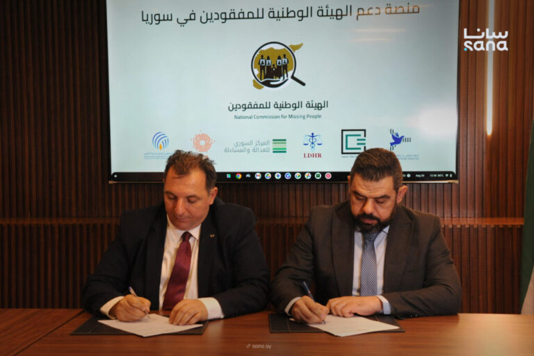 وقّعت الهيئة الوطنية للمفقودين اليوم بروتوكول تعاون مع مجموعة من منظمات المجتمع المدني، يهدف إلى إطلاق منصة موحدة لدعم جهود الهيئة في مجال التوثيق والبحث وتقديم الحقيقة لعائلات المفقودين في سوريا.