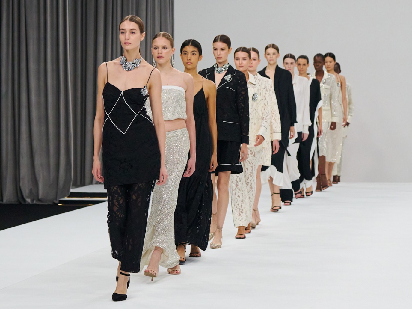 لم يكتفِ بعض المصممين بطبع الأطقم الصيفية الفضفاضة؛ المؤلفة من قمصان طويلة وبناطيل واسعة بالخطوط العمودية، بل زينوها بتطريزات فضية متناثرة بشكل دقيق؛ لتكون النتيجة غير مزعجة للعين، خاصة أننا نتحدث عن قطع نهارية، فظهرت عارضة ماركة لو توينز Le Twins بطاقم أزرق مخطط بالأبيض، تميز بقصته المستقيمة وقميصه الطويل، والبنطلون الذي يلامس الكاحل بالكاد، وقد كانت فكرة تنسيقه مع الصندل الأسود موفقة للغاية.