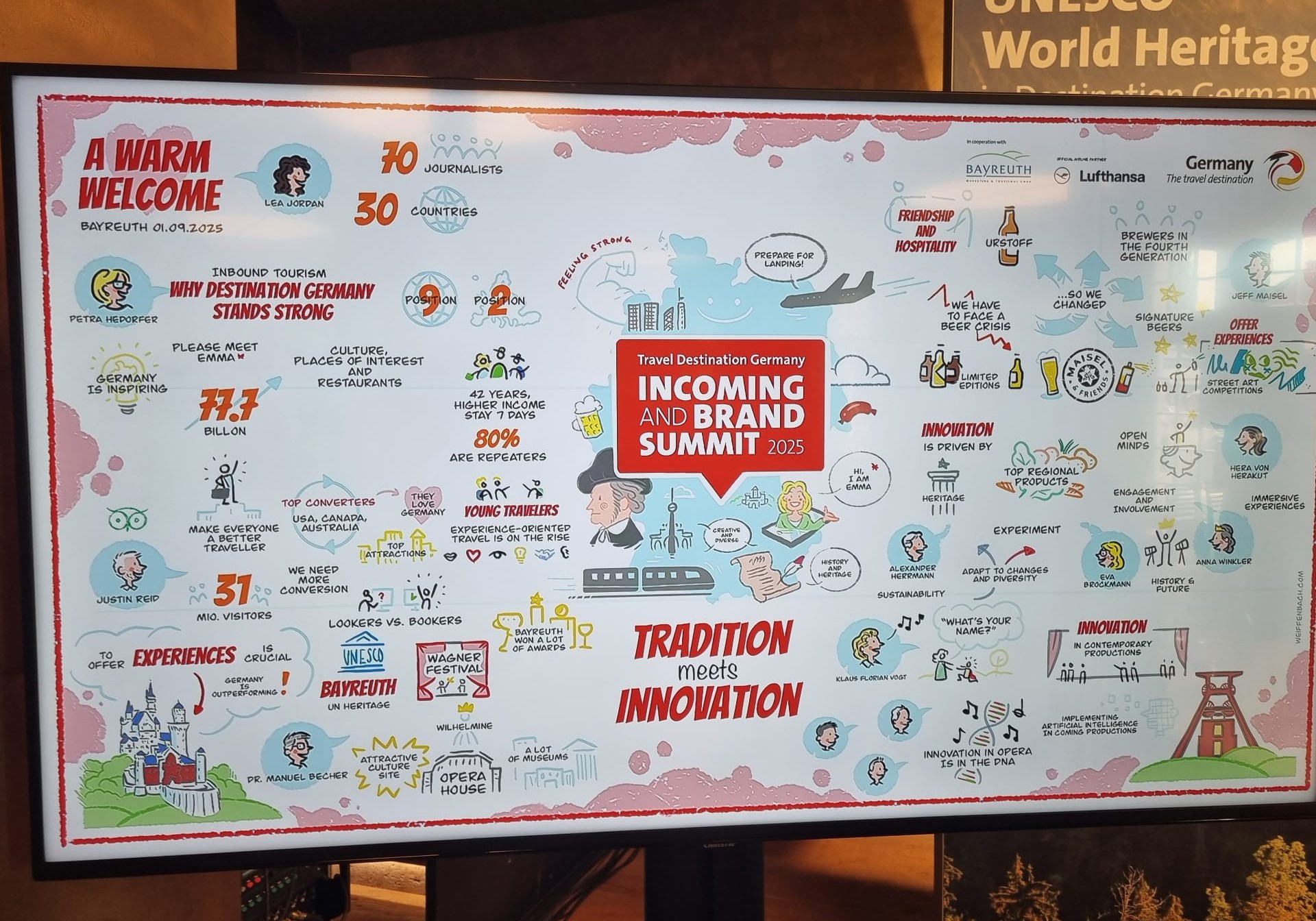 وقد عقد المجلس الوطني الألماني للسياحة في بايرويت (جنوب ألمانيا) مطلع الشهر الجاري ملتقى -يقام شبه سنوي- بمشاركة أكثر من 70 صحفيا من 21 دولة -بينهم موفد الجزيرة نت- تحت عنوان “ألمانيا.. حيث تلتقي التقاليد بالابتكار”، بهدف الترويج للسياحة وإطلاعهم على آخر الإحصاءات التي تظهر نمو القطاع السياحي في البلاد وتسليط الضوء على الوجهات السياحية.
