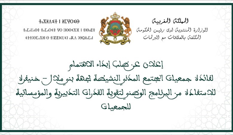 ولهذه الغاية، تعلن الوزارة عن إطلاق البرنامج الوطني لتقوية القدرات التنظيمية والمؤسساتية لجمعيات المجتمع المدني بجهة بني ملال-خنيفرة.
