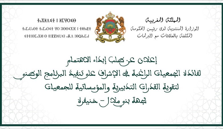 ولهذه الغاية، تعلن الوزارة عن إطلاق هذا البرنامج بجهة بني ملال-خنيفرة، وذلك بإشراف وتعاون مع إحدى الجمعيات الفاعلة والمختصة في مجال مواكبة وتقوية قدرات جمعيات المجتمع المدني، والتي سيتم اختيارها وفق الشروط والكيفيات المضمنة في هذا الإعلان.