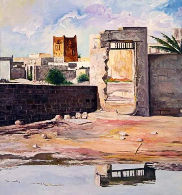 يجذب التكوين البصري في هذه اللوحة عين المشاهد إلى حي قديم يتشكل من جدار شبه مهدم، يفتح على فضاء داخلي، وكأنه نافذة تطل على ذاكرة المكان، وقد استطاع عبيد سرور أن ينجز هذه اللوحة من خلال عناصر بصرية عديدة، فهناك الجدران المبنية من الطين ومن الحجر المتهالك، ما يعكس طبيعة العمارة التقليدية في الإمارات، وقد وجه الرسم عين المشاهد نحو تفاصيل عديدة، كفتحات النوافذ والجدران التي تصمم لأغراض مقصودة، مثل الوقاية من الحر وأيضاً للحفاظ على الخصوصية.