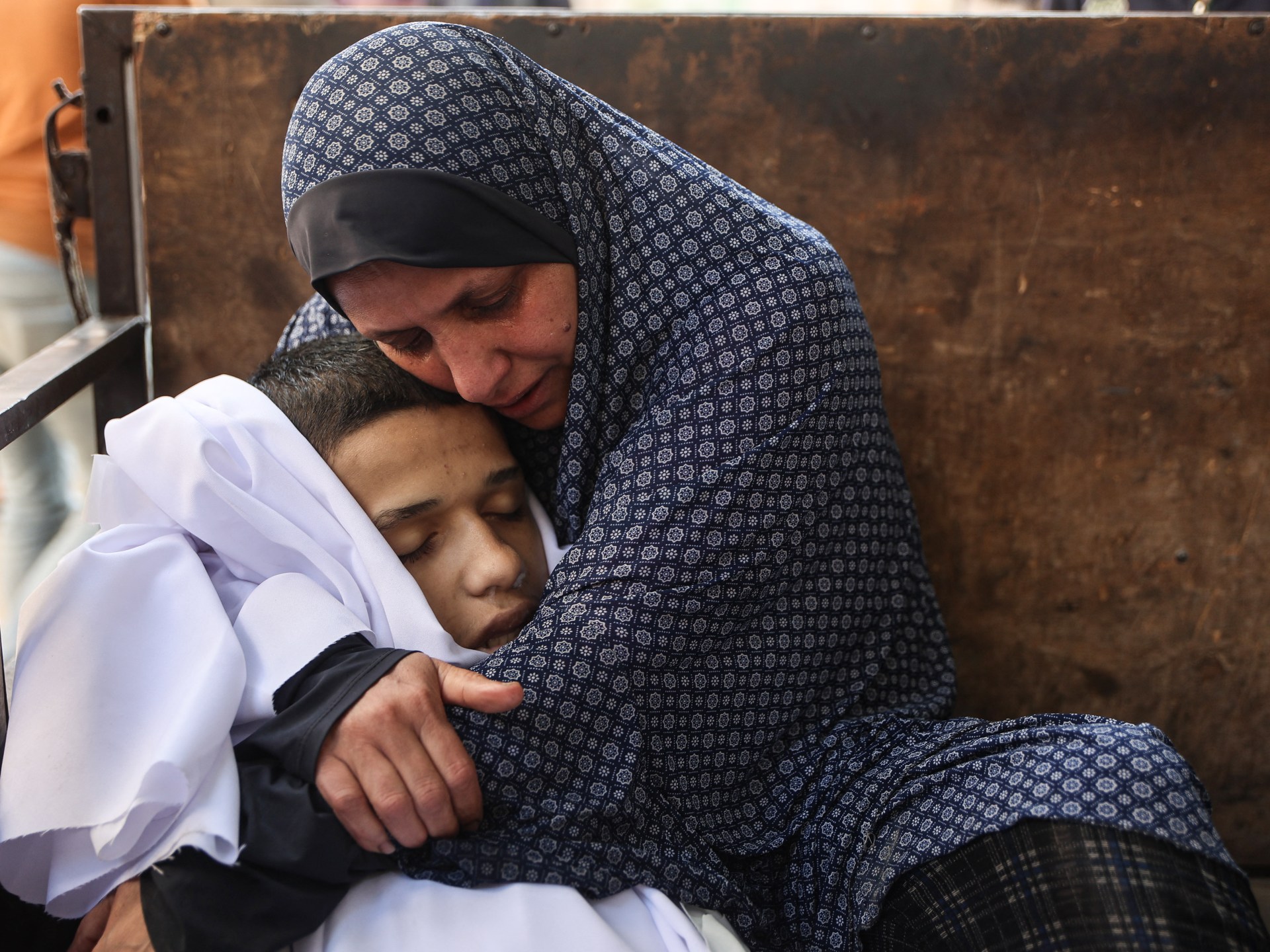 أقارب شهيد قي باحة مشفى الشفاء بمدينة غزة (الفرنسية)