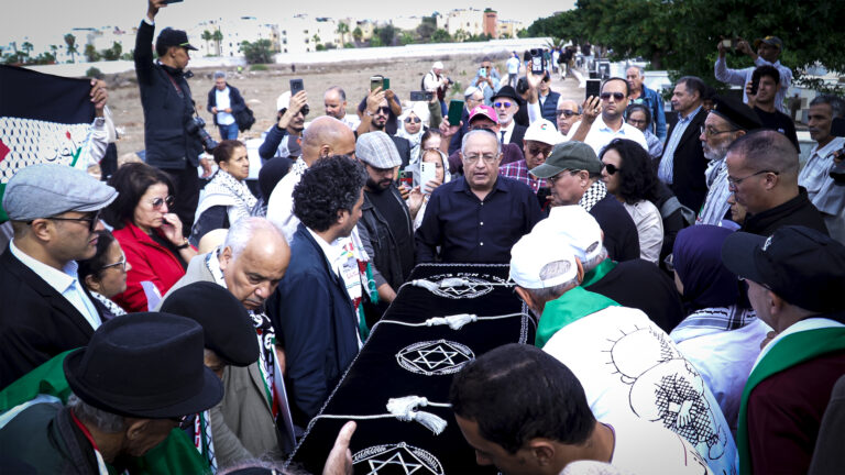 تحت شمس خريفية ناعمة، وبين زحام الوجوه المتأثرة، توشحت المقبرة اليهودية بالدار البيضاء بألوان العلم الفلسطيني الذي ظلّ يرافق سيون أسيدون حيًّا، وها هو اليوم يظلّل نعشه في يوم وداعه الأخير.