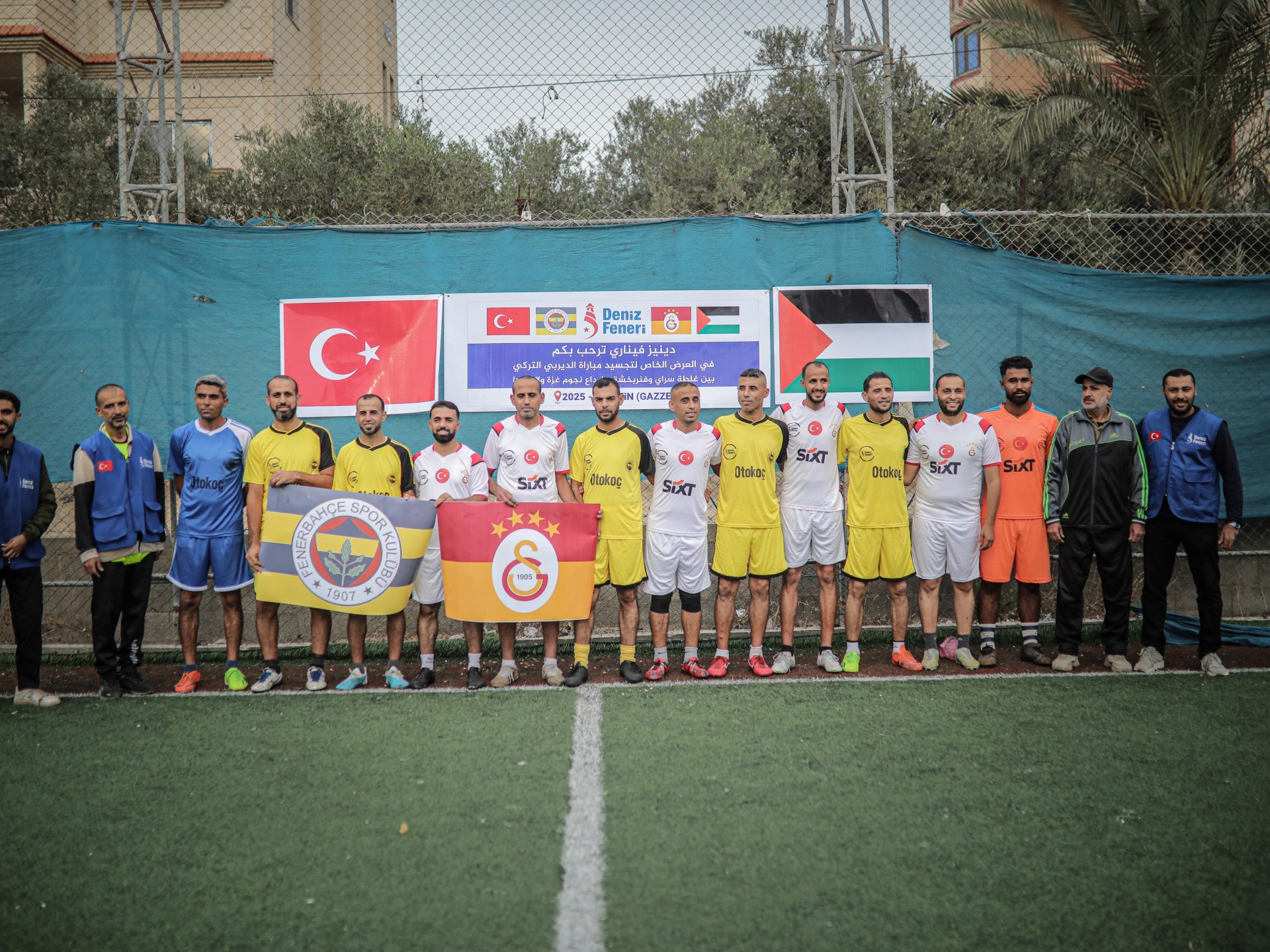 ونظمت جمعية (دينيز فيناري) التركية، الفعالية على ملعب خماسي نجا من تدمير واسع طال البنية الرياضية في القطاع، وارتدى خلالها اللاعبون قمصان الفريقين التركيين.