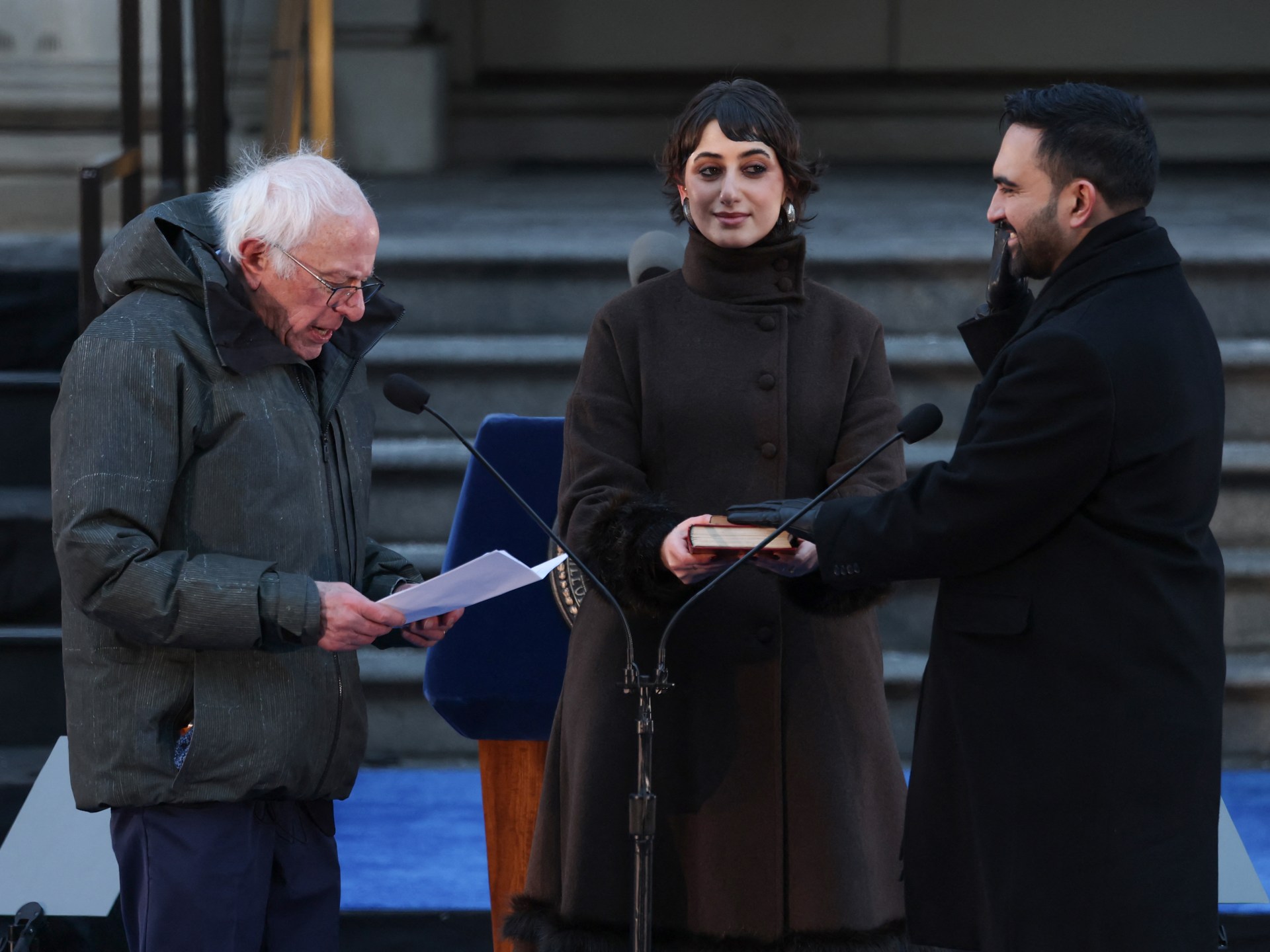 وتقدم ممداني إلى المنصة برفقة عضو مجلس الشيوخ الأميركي بيرني ساندرز الذي أعلن دعمه الصريح له خلال الحملة الانتخابية، وأدى اليمين واضعا يده على المصحف الشريف الذي كانت تحمله زوجته راما دوجي.