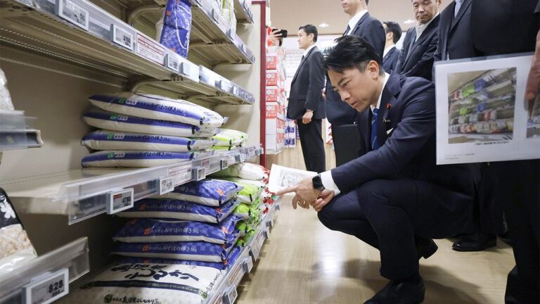 (النص الأصلي باللغة اليابانية، الترجمة من الإنكليزية. صورة العنوان الرئيسي: وزير الزراعة والغابات ومصايد الأسماك كويزومي شينجيرو يتفقد الأرز المعروض للبيع في أحد متاجر السوبر ماركت في طوكيو في 23 مايو/أيار 2025. © جيجي برس)