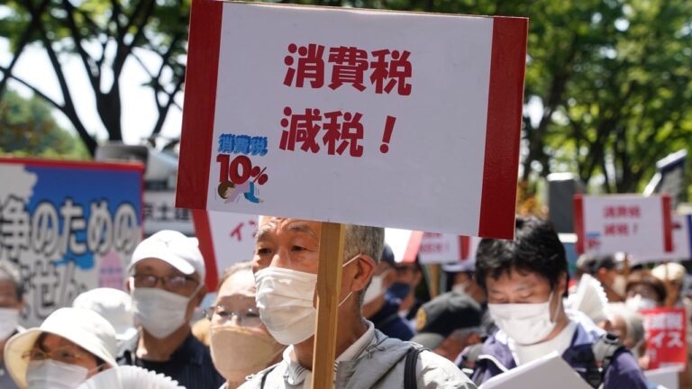 (المقالة الأصلية منشورة باللغة اليابانية، الترجمة من الإنجليزية. صورة العنوان: مشارك في تجمع عيد العمال لعام 2023 في متنزه يويوغي يحمل لافتة تدعو الحكومة إلى خفض ضريبة الاستهلاك، وكان التجمع من تنظيم الاتحاد الوطني لنقابات العمال. © جيجي برس)