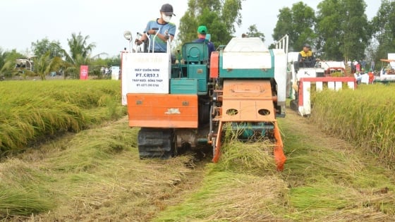 تُطبّق دائرة الإرشاد الزراعي في مقاطعة آن جيانغ نموذجاً لاستخدام الميكنة في الإنتاج، مما يُسهم في خفض تكاليف العمالة، وتحسين الإنتاجية وجودة المنتجات، وزيادة دخل المزارعين. الصورة: ترونغ تشان.