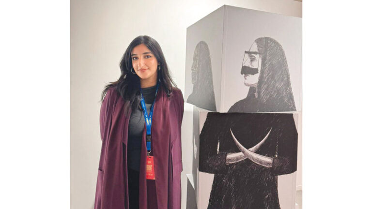 الفنانة الإماراتية مريم القاسمي، عملت على الذاكرة الإماراتية والحكايات الشعبية، وقالت عن عملها: «اخترت ثلاث شخصيات تعرف في الحكايات الشعبية، هي أم الدويس وحمارة القايلة وأبودرياه، وهو عمل يقوم على أهمية النقل الشفهي، لأن هناك اختلافاً كبيراً في تناقل الحكايات وتفاصيلها، وهذا نلاحظه في اختلاف التصورات الخاصة بكل شخصية». وأضافت: «لا أحد يعرف المزايا الشخصية الحقيقية لهذه الشخصيات، ولكن بحسب القصص التي تروى، يتم تخيلها، وهذا ما دفعني إلى إجراء بحث يقوم على أن أطلب من المشاركين رسم تصورهم لكل شخصية، وقد بنيتُ تركيبة العمل والصور من خلال الرسومات التي تسلمتها من المشاركين في البحث». ولفتت القاسمي إلى أن العمل البحثي جعلها تكتشف أن الصغار قدموا رسومات بنسخ مشابهة لرسومات الأمهات، وهذا يعطي مثالاً عن أهمية النقل الشفهي وما يتركه من أثر ينعكس على المخيلة. ونوهت بأنها طلبت الرسومات من مختلف الشرائح العمرية، موضحة بأنها تعمدت بعد الحصول عليها بناء كل شخصية على شكل مجسم مكون من ثلاثة مكعبات متحركة وتحتوي على رسومات متعددة، بحيث إذا تحريك أي مكعب فسيغير الشكل النهائي للشخصية. وأشارت إلى أن العمل صنع من الخشب والمعدن، والرسومات تمت بشكل ديجتال، وقد نفذت الأعمال بطرق عشوائية كي تكون الملامح غير واضحة. ولفتت على أن هذه القصص تلعب دوراً مهماً في الثقافة المحلية، وقد اختارت تسليط الضوء عليها، نظراً لأهمية التناقل الشعبي في ثقافة المرء ومخيلته.